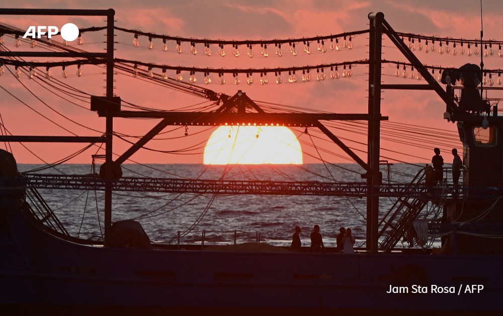 This photo, taken on March 5, 2024, shows a vessel identified by the Philippine Coast Guard as the 'Chinese maritime militia' during sunrise in the disputed South China Sea. The Philippines reported that China Coast Guard vessels caused two collisions with Philippine boats and water-cannoned one of them, leaving four crew members injured during a resupply mission in the South China Sea.