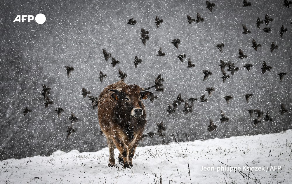 A cow stands in a snowy field as birds fly over in Sorbiers near Saint-Etienne, central-eastern France on March 3, 2024.​ According to Meteo France, the departments of Lozere, Ardeche, Loire and Haute-Loire are the most affected by the snowfall, and have been placed on "orange alert".​ ​