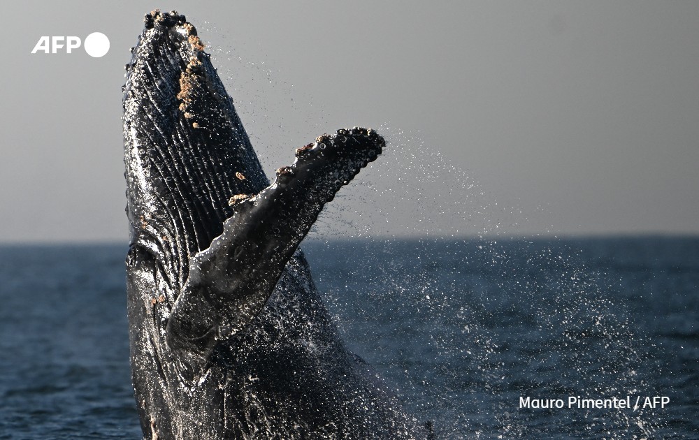 A humpback whale (Megaptera novaeangliae) jumps at the coast of Niteroi, Rio de Janeiro state, Brazil on June 20, 2024.