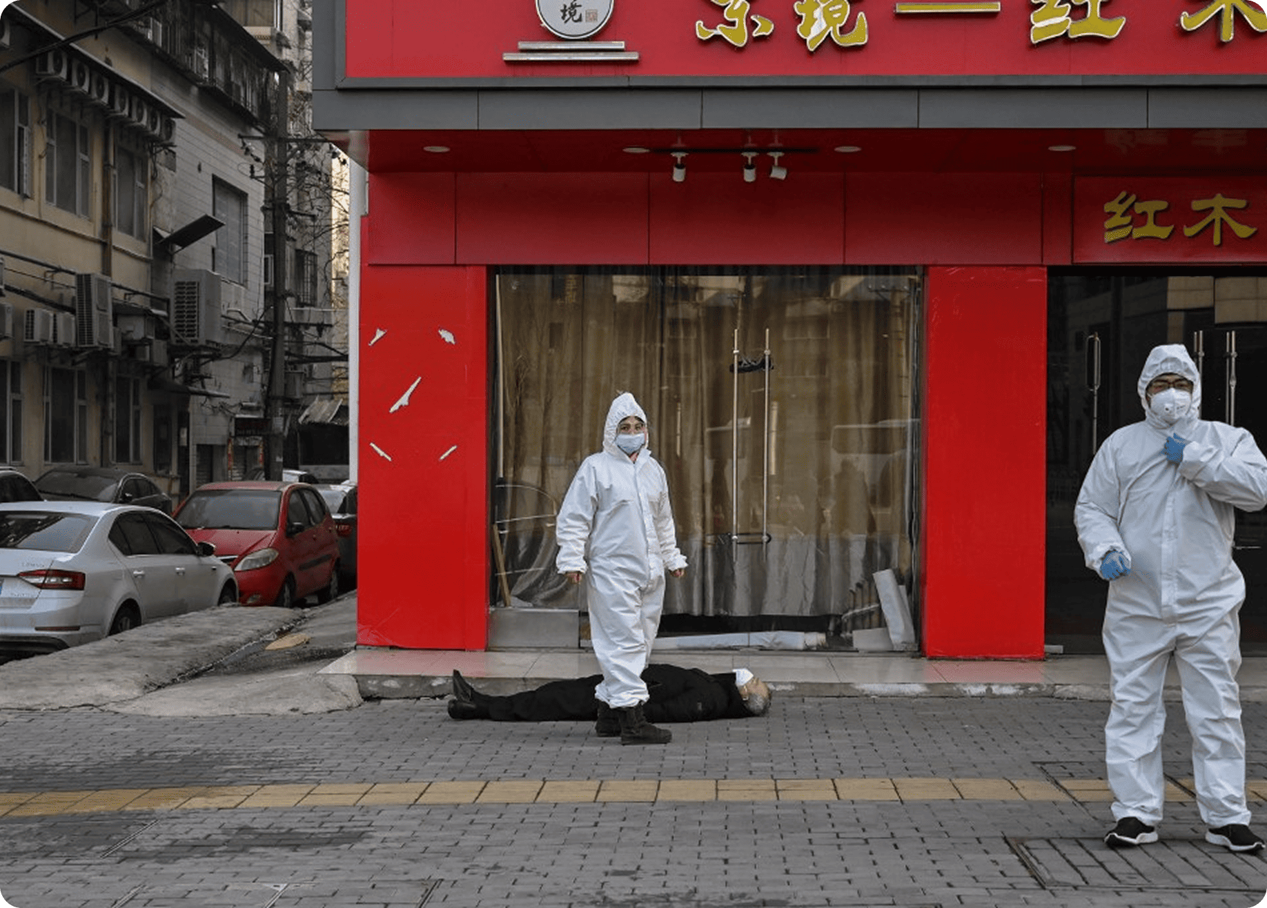 Officials in protective suits check on an elderly man in Wuhan. Hector RETAMAL / AFP