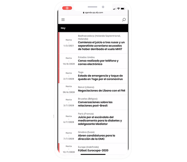 Agenda internacional, económica, deportiva… Encuentre de manera instantánea todos los acontecimientos previstos registrados por AFP inmediatamente tras haber sido ingresados por nuestros periodistas.