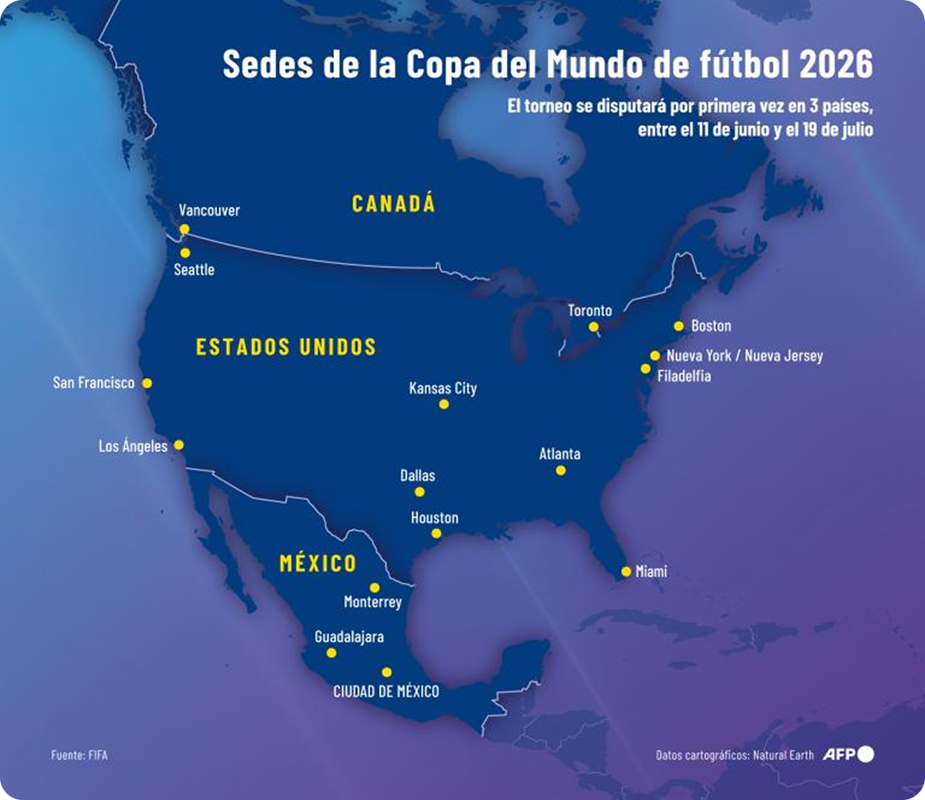 AFP en el terreno en 3 países y 16 ciudades sede.