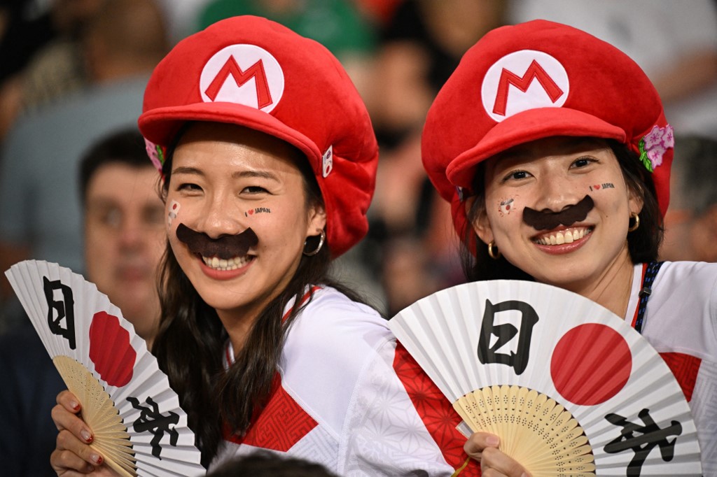 Deux supportrices japonaises déguisées en Mario lors de la Coupe du monde de rugby pour le match Japon-Samoa au stade de Toulouse, France, le 28 septembre 2023. © Lionel Bonaventure / AFP