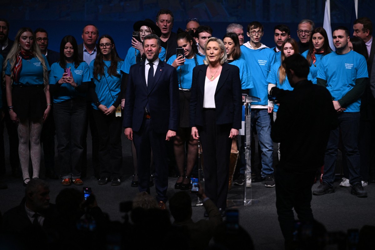 La présidente du groupe parlementaire du parti d’extrême droite français Rassemblement national (RN), Marine Le Pen (au centre à droite), et le candidat du Rassemblement national (RN) à la mairie de Marseille, Franck Allisio (au centre à gauche), chantent l’hymne national lors de la campagne de ce dernier à Marseille, le 16 janvier 2026. © Miguel Medina / AFP