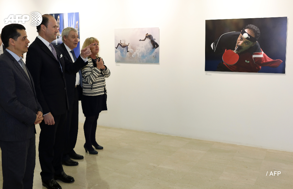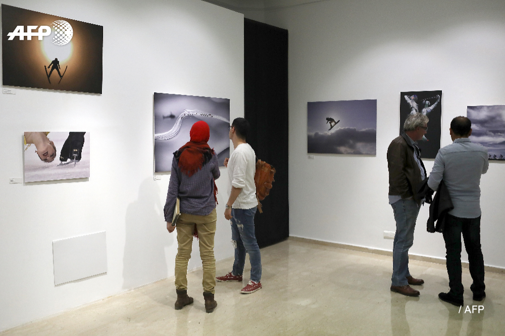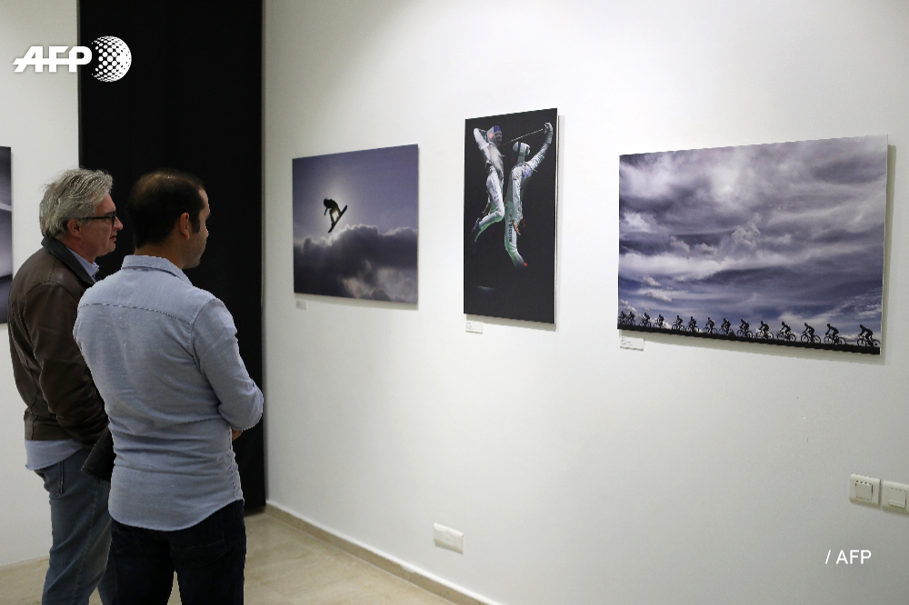 RABAT - 06/04/2018 - Vernissage de l’exposition AFP « Sports et émotions »: quatre visiteurs découvrent les photographies présentées par l’Agence France-Presse à la galerie de l'Institut français de Rabat le 6 avril 2018. © AFP