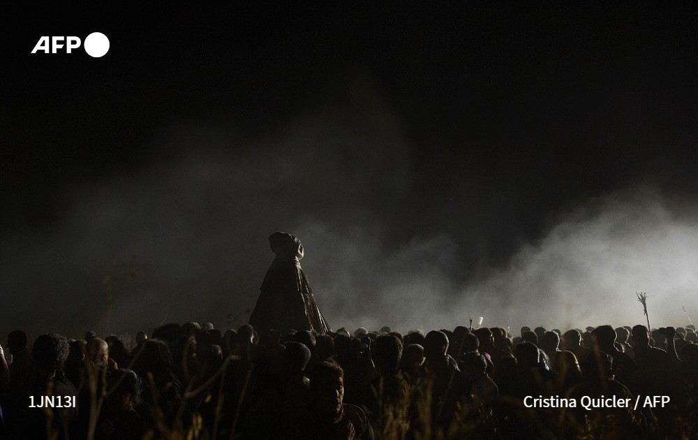 La photographie représente l’événement qui ne se répète qu’une fois tous les sept ans : la Virgen del Rocío qui voyage de nuit, de son ermitage d’El Rocío à la ville d’Almonte, entourée de fidèles.