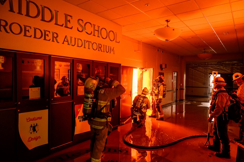 Des pompiers s'apprêtent à combattre les flammes à l'intérieur de l'auditorium de l'école primaire Eliot Arts Magnet lors de l'incendie d'Eaton dans la région d'Altadena, dans le comté de Los Angeles, en Californie, le 8 janvier 2025. © Josh Edelson / AFP