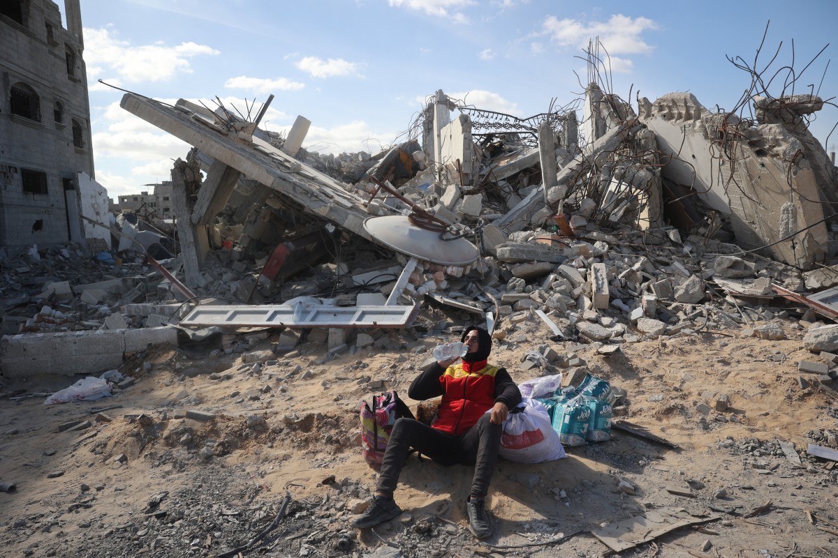 Un homme palestinien boit de l'eau en étant assis à côté de ses affaires près d'une maison détruite dans la ville de Rafah, au sud de Gaza, le 20 janvier 2025, alors que les habitants retournent chez eux après un accord de cessez-le-feu conclu la veille entre Israël et le groupe palestinien Hamas. © Bashar Taleb / AFP