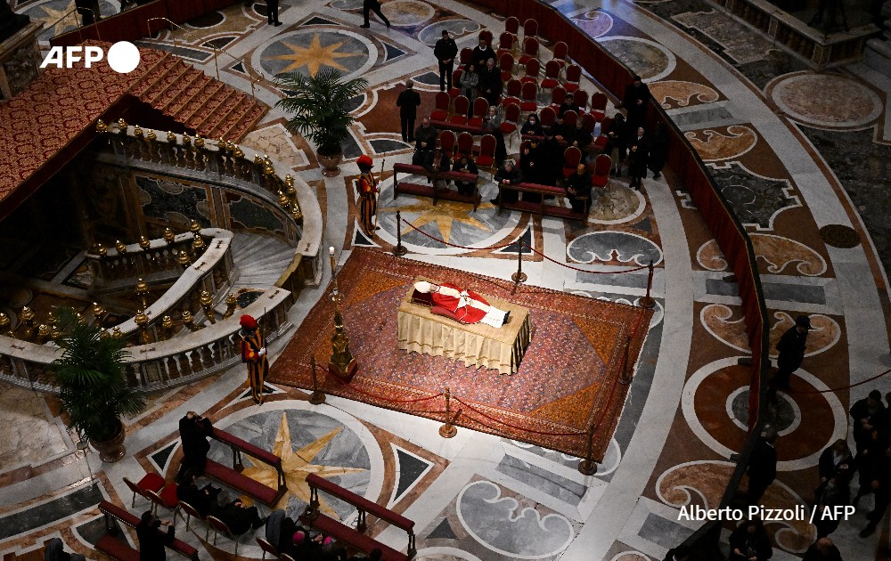 The body of Pope Emeritus Benedict XVI lies in state at St. Peter's Basilica in the Vatican, on January 3, 2023. Benedict, a conservative intellectual who in 2013 became the first pontiff in six centuries to resign, died on December 31, 2022, at the age of 95. Thousands of Catholics began paying their respects on January 2, 2023 to former pope Benedict XVI at St Peter's Basilica at the Vatican, at the start of three days of lying-in-state before his funeral.