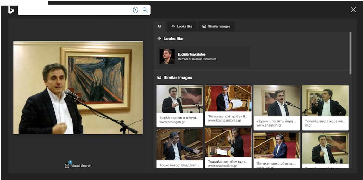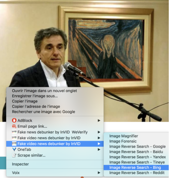 Vous avez téléchargé l'extension InVID-WeVerify, (voir aspects techniques ci-dessous) allez dans l'onglet "Interactif".  Vous avez plusieurs propositions d'images et de vidéos. Nous allons nous concentrer sur la première  image proposée qui est celle du ministre grec de l'Economie, Euclide Tsakalotos, parlant devant le tableau "Le Cri" du peintre norvégien Edvard Munch. Cette image est une parodie : Tsakalotos a été ridiculisé pour avoir parlé devant un portrait de femme nue peint par Modigliani.