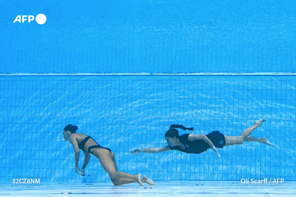 L'entraîneure de l'équipe américaine de nage artistique et synchronisée Andrea Fuentes (d) vient sauver sa nageuse Anita Alvarez qui a perdu connaissance lors des Mondiaux de natation, à Budapest, le 22 juin 2022. (Photo by Oli SCARFF / AFP)